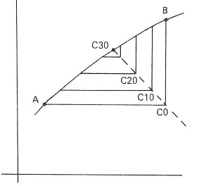 The axes and curve are to appear for 3 successive frames while the point C is moved from C0 to C30, and the horizontal and vertical projections shrink to zero. The captions X and Y must move and shrink to suit. It should only be necessary to specify picture parts and the sequential operations such as that the line AC must be horizontal with one end point on the curve and the other controlled by an invisible mover which moves at a constant rate in a specified direction. Similarly the captions are related to their projection line segments in both position and size.