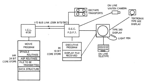 Most computer-made films to date have been made on computer film recorders (e.g. SC4020), which are essentially non-interactive. The work described here has been carried out on a system primarily developed for interactive computer graphics illustrated by Fig. 8.2. The movie program, written in Fortran, is executed by the I.C.L. 4130, a medium-scale scientific computer. It uses both graphics (SPINDLE) and data structure (ASP) packages in producing display instructions for the D.E.C. Type 340 display. The PDP-7 is concerned with updating the display, controlling both the link transmissions and the on-line movie camera mounted in front of the slave display, as well as handling interrupts generated by the user with the light-pen and keyboard. The PDP-7 can also store the display files with incremental changes on DECtape, an economic magnetic tape system. These tapes can subsequently be used for frame expansion and contraction editing without the need for the larger computer. A standard executive program in assembly language is used to provide all these functions and the movie program is strictly confined to the larger computer and the ASA Fortran language.