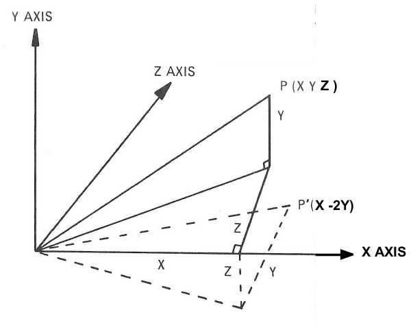 A point in three-dimensional space is normally represented in the form (X,Y,Z), the three co-ordinates X, Y, and Z being the distances measured along three mutually perpendicular axes Fig. 8.4. However we can represent the same point in the form (x,y,z,w) where x = X/w etc. known as the homogeneous form; w can be considered as a scaling factor.