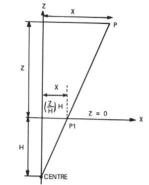 Fig 8.5: A perspective projection on to the plane z=0 with the point (0,0,-H) as the centre of perspective.
