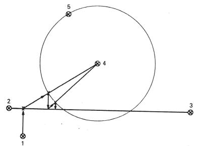 To solve the constraints on each point, routines are used which give the co-ordinates of a point on a line, sphere or plane nearest to the given point, so that if point 1 is constrained to be collinear with 2 points, 2 and 3 say, and be on a sphere, whose centre is point 4, and on which point 5 lies, 1 is moved alternately to the line on which 2 and 3 lie and to the given sphere until the movement is less than .5 unit in the X,Y and Z directions (see Fig. 8.6). In the case of line cutting a sphere in 2 places the point moves to the nearer and in the case of the line not cutting the sphere at all an error message is output. The latter case is discovered when during the iteration process it returns to a previous position.