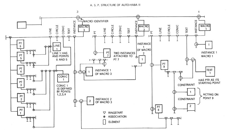 The upper ring of a line, circle, conic or text element consists of an associator on a macro's ring of lines, circles, conics or text, plus associators to the lower rings of point elements used in its definition. The lower ring of a point element has 3 ringstarts, the associators on one ring pointing to line elements etc., using this point, those on another to constraint elements and those on the third to instance elements using this point as an attachment point. The upper ring of an instance element has an associator on the instance ring of an identity, one pointing to the lower ring of its attachment point and others pointing to the lower rings of other instance elements in whose definition the former appears.
