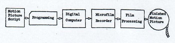 A programming language is used to translate the motion picture script into a computer program. The program, usually in the form of a deck of cards, is processed by the digital computer which generates a magnetic tape output for input to the microfilm recorder. The recorder, containing a cathode ray tube and motion picture camera, produces an exposed roll of film that is then developed to yield the finished motion picture.