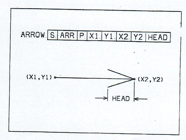 Basic figures are provided for in the movie language. For example, Figure 3 illustrates the command used to generate an arrow. S and ARR denote the stack and array numbers in which the arrow is to be stored. The parameter P equals 0, 1, 2, or 3 depending upon whether the shaft is to be solid or dashed and the head open or closed. The arrow is directed from the coordinates (X1, Y1) to (X2, Y2) and the size of the head is specified by the parameter HEAD. Subroutines for generating circles, rectangles, triangles, crosses, grids, clocks, and sine waves are also available. Some electronic circuit symbols are included.