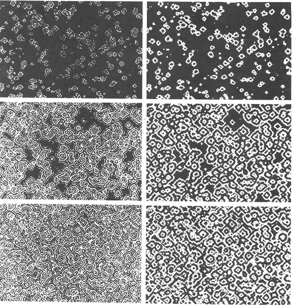 The first example (Fig. 7.1) is related to crystallization, etching, annealing, and nucleation on a substrate (i.e. simultaneous environment-dependent sublimation and crystallization). The computation starts with either 1/2 or 1/3 white spots (A's) on a black background (O's). The program then agitates by turning black (A's to 2's) one-sixth of the white spots above, below, right of or left of black ones, and then turns white (C's) one-sixth of the black spots next to white ones. (Next for computational purposes, all blacks are recoded as O's and whites as A's). Then the program coalesces by turning white the black spots with predominantly white neighbourhoods (i.e., where 3 or 4 of the 4 orthogonally adjacent spots are white), and by likewise turning to black the white spots in predominantly black neighbourhoods. The process iterates, performing the coalescing operation twice after each agitation.