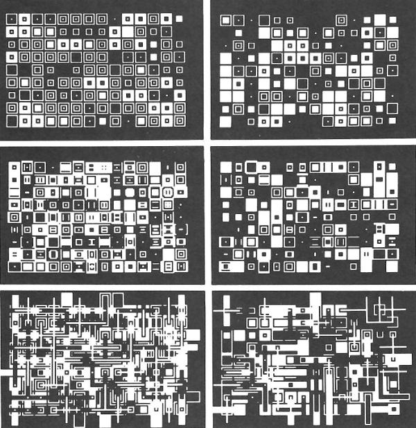 Fig. 7.3 illustrates the production of designs based on an explicitly defined pattern, in this case the letters BTL. Each time the pattern is laid down, an X-Y location is chosen at random, also a size from 2 to 5. The pattern is first written in O's, then displaced downward and to the right and written in A's. In the left-hand outputs only one black-white pair is written each time; in the right hand set, four successively displaced black-white pairs are overlaid each time.
