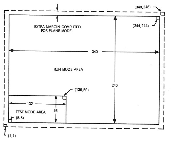 The programmer imagines significant areas for different modes of operation as shown below. The normal run mode area is 340 units wide by 240 high; in the test mode, only the indicated 132 × 55 area is computed internally, and it is output by printer, not via microfilm (Fig. 7.5).