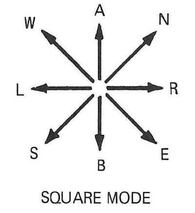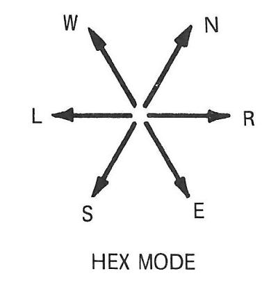 Computation and output are similar for square and hexagonal modes except that in film output for hexagonal mode, even-numbered lines are shifted right by half the dot spacing, and a different interpretation is given to the directions of nearest neighbours. Directions are specified by the letters A, B, R, L, N, E, S, W which may be thought of as meaning above, below, right, left, north, east, south, and west, as shown in Figs. 7.8 and 7.9.