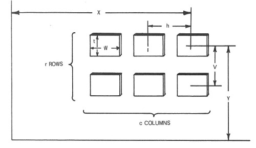 Explicit patterns, specifying a subset of boxes of a rectangular array, are defined by 12-digit octal numbers (one digit represents three boxes, a one-bit meaning treat the box). All patterns thus defined are multiples of 35 in width, leading zeros being optional. If the number of columns is more than 36, then two or more of the 12-digit numbers are taken to specify the top row of the pattern, the next group of numbers defines the next row, etc. Thus the pattern named TABLE, which may be taken as a side view of a long 85 × 4 table, is coded remotely (not in line) as follows: