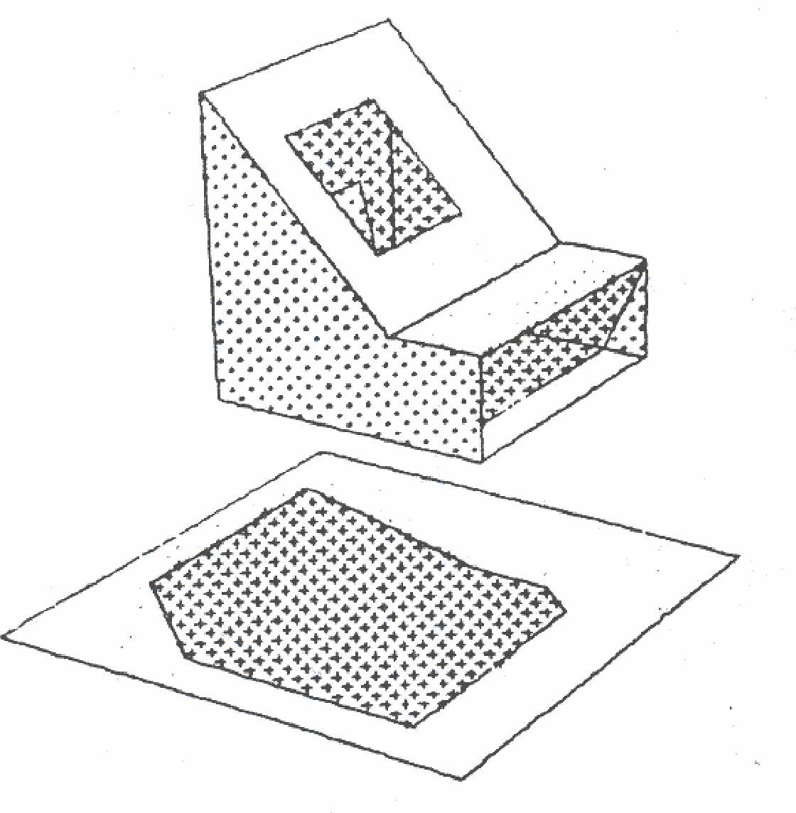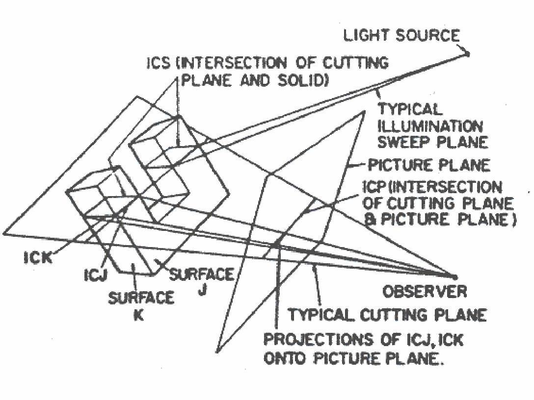 The basic concept of the method of cutting planes is that when the intersections of a plane that passes through the observation point and assemblies of planes which can enclose one or more polyhedra are pro- jected onto the picture plane, these projected intersections are colinear. In detail. as illustrated in Figure 9, the strategy is: