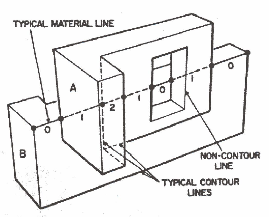 The methods of quantitative invisibility are useful because techniques for detecting changes in quantitative invisibility along a line are more economical than measuring the visibility, absolute or quantitative, at a single point. These techniques are applicable only to material lines which are lines that have specific end points and that do not pierce any bounded surface within its boundary. Objects that are manufactured contain only material lines. A contour line is a line along which the line of sight is tangent to the surface of the solid. For polyhedra, given a specific viewpoint, a contour line is a material line which is the intersection of two surfaces, one of which is invisible. For a given viewpoint the quantitative invisibility of a material line can change only when it passes behind a contour line. Figure 8 illustrates how quantitative invisibility varies as a line passes behind a solid. Notice that only surfaces which arc viewed from the spatial side affect the measurement of quantitative invisibility. In determing line visibility for line drawings only those segments of the line for which quantitative invisibility is zero are drawn, For this application only the quantitative invisibility of vertex points are stored and changes in quantitative invisibility along a line are measured and discarded as soon as commands to the graphic device are generated. The methods of quantitative invisibility can be applied to shading a picture if the changes in quantitative invisibility of a line from the light sources and the observer are stored and compared.
