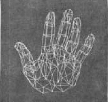 Although outside the scope of this paper, it should be noted that this is still a formidable task. For the hand, a plaster of paris mold was made. (A word of caution to anyone wishing to make a similar mold: it is more comfortable to shave the back of the hand before making the mold than to have the hairs pulled out by the mold.) Next, a plaster model was made from the mold and covered with a thin layer of latex material. Polygons were drawn on the latex. It was necessary to extract the three dimensional coordinates of some 270 corner points defining the surface of the hand, organize them into about 350 polygons, and organize the polygons into the parts of the hand. This was followed by determining the axes about which each part rotated. Figures 3, 4, and 5 show the polygons drawn as lines, polygon surfaces, and the smooth shaded version.