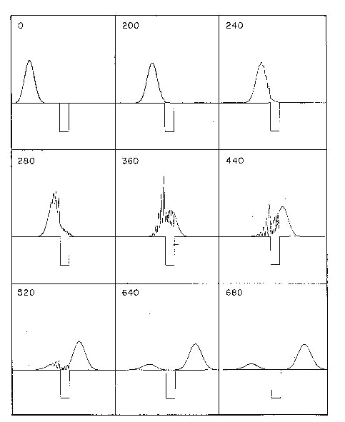 VI. RESULTS AND DISCUSSIONThe film we have produced by the methods discussed here consist of six scattering events each lasting about 1 min. The entire film, including titles, has a running time of about 10 min. Examples of what is seen in the film are shown in Figs. 1-6. The first three sets of diagrams represent reflection and transmission by a potential well, and the second set of three by a barrier. For the most part these illustrations speak for themselves. We should emphasize, however, that the rapid oscillations appearing when the packet is near the potential are accurate and do not result from approximations or machine error.