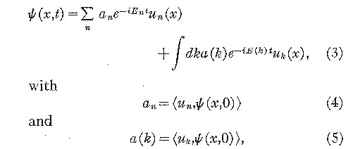 where ψ(x,0) is the given initial state of the system. This procedure, however, has not been adopted here for several reasons. To begin with, for almost all potentials the eigenfunctions and eigenvalues have to be determined numerically. Even if we were to quantize in a large finite region (the one-dimensional analog of box normalization), in order to reduce the continuous part of the spectrum to a discrete spectrum, there would obviously be a large number of states involved in Eq. (3). Second, even with all the eigenfunctions and eigenvalues known or evaluated, the computation of the terms comprising Eq. (3) at each x and t of interest is a lengthy task. Finally, we should have to restrict the initial state of the system, if ψ(x,0), to some limited combination of eigenstates or be forced to carry out the many numerical integrations required to evaluate the coefficients an and a(k) given by Eq. (4) and Eq. (5) and required in Eq.( 3).