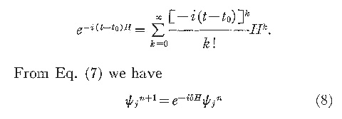 To avoid these problems we have found it convenient to deal directly with Eq. (2) making use of the eigenstate expansion Eq. (3) only for the purpose of checking the accuracy of our solution at a few isolated values of the time t. In dealing with Eq. (2), we convert it from a differential equation to a finite difference equation in both space and time, a procedure which is described in detail in the following section.
