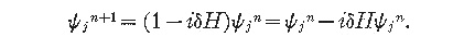 One feature of this equation is especially attractive: it is an explicit differencing scheme, i.e., one which gives the wave function at time step n+l directly in terms of the function at the earlier time n. Clearly this permits a straightforward integration scheme and allows for an easy determination of ψ for all n and j. The scheme, however, has the very serious drawback of being unstable; that is to say, roundoff error and errors arising from dropping terms of order δ2 and higher in the expansion of e-iδH can grow without bounds as the time integration proceeds from step to step.