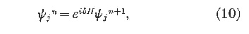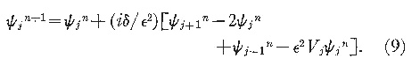 In order to convert Eq. (2) to a finite difference equation, let us designate time by a superscript n and spatial position by a subscript j. Thus ψ(x,t) → ψjn. The various x values become jε where ε is the mesh width and j=0, 1,..,J. Similarly, the time variable goes over into nδ where δ is the time step and n=0, 1,2,....