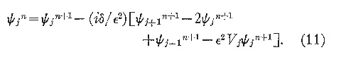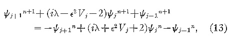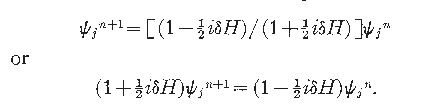 Though stable, this equation is implicit rather than explicit. By this we mean that ψn+1 is not given directly in terms of ψn and certain algebraic techniques must be applied in order to obtain the wave function at time step n+1 from that at n. This is not an insurmountable problem - in fact the differencing scheme we finally settle on is implicit, and we indicate below the way it is handled. For the present we remark that Eq. (11) must be ruled out on the grounds that it is not unitary, a flaw present in Eq. (9) as well.