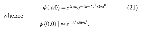 We see that this packet is centered about x=x0 with a spread in x governed by σ0. The factor eik0x makes our initial wave function move to the right with average momentum k0. Since we are quantizing in a large box of length L at the edges of which the wave function must vanish, it is clear that x0 and σ0 must be chosen so that ψ(0,0) and ψ(L,0) are essentially zero, Choosing x0 = L/4, we find