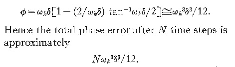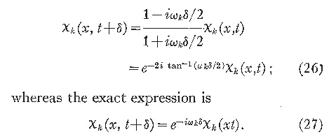 From Eqs. (26) and (27) there result two important consequences. First, the over-all normalization of each mode is constant in time; so those modes which were negligible at t=0 remain negligible. This, of course, is a consequence of the unitarity of approximation (12). Second, at every time step a phase error φ is introduced into each mode of the system; by comparing Eqs. (26) and (27) we find