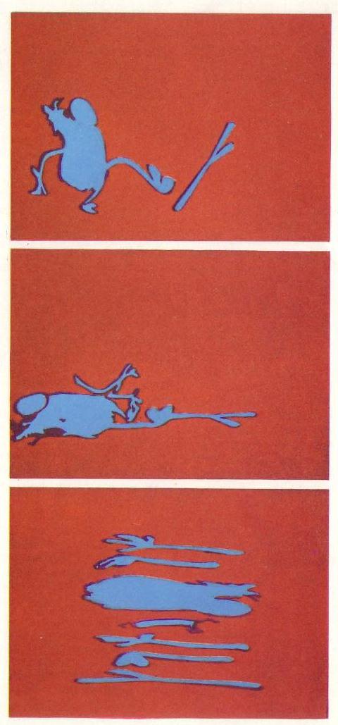 SCANIMATE uses as its starting point ordinary artwork. This is viewed by a TV camera and converted into signals that can be processed by an analog computer. As with CAESAR, an inbetweening process is usually employed, between two or more extremes. The original artwork image can be put through an almost infinite variety of motions: exploding, zooming to a point or vanish, plasticising, growing, shrinking, pulling through itself, revolving twisting, squeezing, undulating and more. A particular advantage is that this interactive system allows the results to be seen and corrected within minutes. The principal criticism of all non-interactive systems is that it takes ages to produce a correct piece of film, particularly if your installation works in batch-time with a long turn-round time.