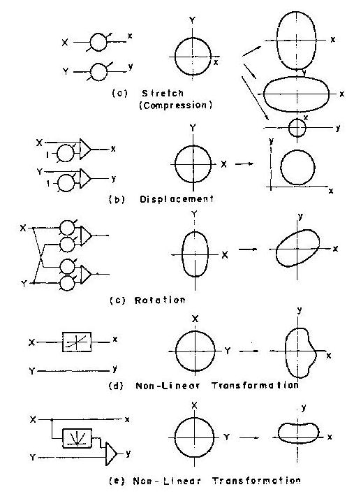A circle can be generated by a so-called circle-test circuit, shown in Figure 1. In an analog computer, the modification of a pictorial pattern can be performed simultaneously with the generation of the circle. Thus, it is possible to produce a picture by varying in succession the manner of modification as numerous circles are being produced repeatedly one after another. These are displayed on a cathode ray tube. If slight differences are introduced in the parameters in the transformation circuit for each one of these individual curves, then it will appear as if the picture is moving continuously.