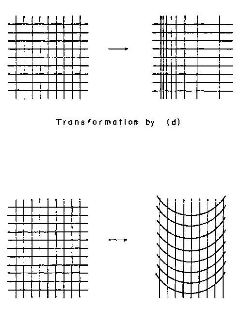 Although all of these are transformations of the coordinates, the procedures of (d) and (e) in Figure 2 have the effect of distorting the coordinate axis. Figure 3 shows how the coordinate grids are changed by these transformations. Thus, if one takes into consideration these transformations of the coordinate grids, one can anticipate the shape which a given pictorial pattern will have after its transformation. In this manner, one can modify the basic circle to produce a large number of desired shapes. Besides modifying circles, it is naturally possible also to begin with other differential equations. For example, one can use a damped oscillation circuit. If this is displayed on the phase plane, one will obtain logarithmic spirals. However, if the decrement is made smaller, it will be possible to black out the area inside the circle. If this process is discontinued before completion, one will obtain a circle with thick lines. Other differential equations for obtaining other solutions are also conceivable. However, just as in the case of modifications, if they are exceedingly complex, they will cease to be practical.