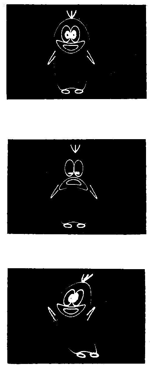 Animated cartoons were actually prepared on the basis of the methods described above. A typical example is shown in Figure 13. As is evident from the figure, the pictures can be moved about quite freely by this method, and the animated cartoons made in this manner were more or less satisfactory. In the future, when further improvements have been incorporated in the picture input device and the digital program, it is expected that this system will be quite satisfactory from the practical standpoint.