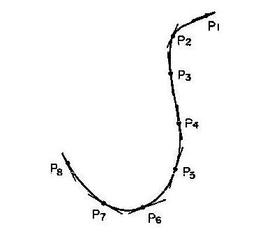 As shown in Figure 7, if one specifies both the positions of each of the points and the tangents of the curves at each of the points, then it. will be possible to reproduce the original curve with almost complete fidelity. However, a prerequisite for this is that the series of points must have been sampled with a sufficient degree of coarseness making possible a faithful representation of the original curve.