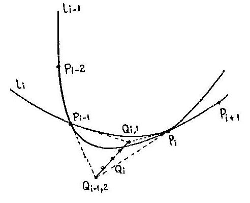 In order to calculate the tangents, the smooth curve passing through a given series of points must be expressed by equations. Here we adopted the parabolic approximation. Let us suppose that there are four points: Pi-2, Pi-1, Pi, and Pi+1 as shown in Figure 8. First, we shall draw the parabola li-1, having an axis perpendicular to Pi-2Pi and passing through the three points: Pi-2, Pi-1, and Pi. Let Qi-1,2 be the point of intersection of the tangents of li-1 at point Pi-1, and point Pi. Next, we shall draw the parabola li, having an axis perpendicular to Pi-1,Pi, and passing through the three points: Pi-1,Pi and P Pi+1. Let Qi,1 be the point of intersection of the tangents of Pi-1 and Pi. Taking into consideration Qi, the central point between Qi-i,2 and Qi,1, we assumed that Pi-1>,Qi, and Pi,Qi were the tangents at Pi-1 and Pi, of the approximate curve between points Pi-1 and Pi. Since the tangents of the curve at each point will not strictly coincide before and after the point, the curve will therefore bend in a different direction at each point. However, if the points in the series have been spaced at suitable intervals, the differences in the tangential directions will be so small as to be negligible, and these variations will make no difference from the practical point of view.