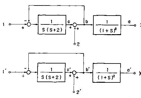 Having obtained the two points P1(x1,y1) and P2(x2,y2), as well as xQ(ζη), the point of intersection of tangents T1 and T2, at P1 and P2, we next draw a curve passing through these points and having the given tangents. This can be conveniently mechanized using the analog elements. Taking into consideration the dynamic characteristics of the XY recorder, we employed the circuit shown in block diagram form in Figure 9. Let us suppose that each input terminal is fed the values: 1 = x1, 1' = x2, 2 = X and 2' = Y (X and Y are certain values), and that the circuit is in steady state. Then the outputs will be x = xi, and y = yi. Let us next change the input at 1 and i' to x2 and y2 respectively, and at the same time let us change the input at 2 and 2' to X + ζ - xi and Y + η - yi, respectively.