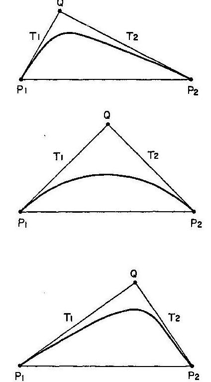 Therefore, the resultant curve l = (x(t) , y(t)) starts from P1(x1,y1), terminates at P2(x2,y2) and has the given tangents at P1 and P2. Curve l has a shape enclosed by the triangle QP1P2, and its shape changes depending upon the directions of tangents T1, and T2, as shown in Figure 10. This method can provide a seemingly natural curve and is quite adequate for the purpose of curve generation required here.