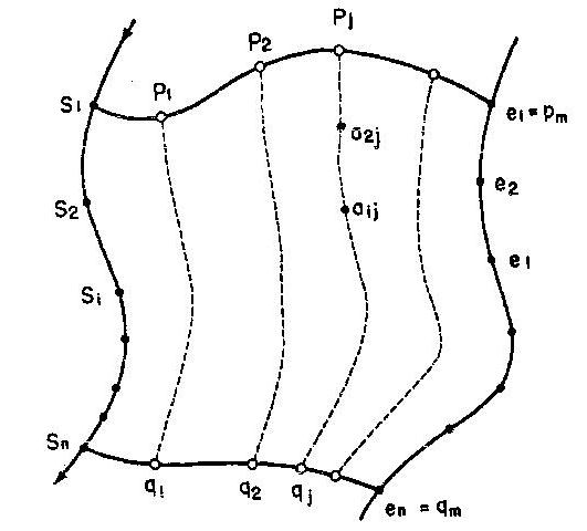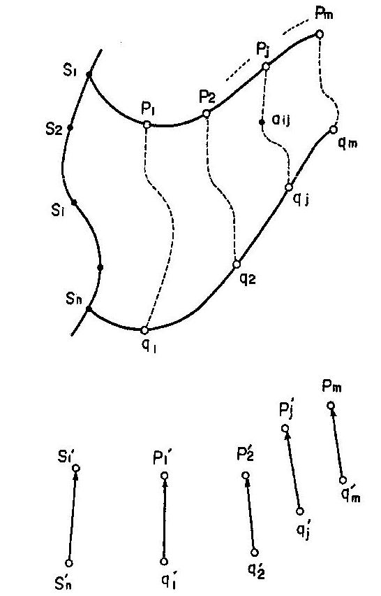 Let us assume that the curve in the original drawing No. 1 is given by the series of points S1, S2...Sn, and that the curve in the original drawing No. 2 is given by the series of points e1, e2...en (see Figure 11). Let us suppose that there is a one-to-one relationship between the points in both series, for instance, that point Si will be at point ei after it has completed its movement. Let us also suppose that points Si and Sn are chosen as representative points, and that the sequence of movements of each is given by points P1-Pm and points q1-qm respectively.