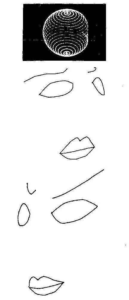 In order to approach this problem, one may formulate, by the trial and error method, an equation corresponding to a clay model such as that shown in Figure 14, and the eyes and mouths can be produced by drawing frontal diagrams. Their x-y coordinates can be read, and assuming them to be present on this curved surface, one can calculate z from the above equation. If the spatial pattern is prepared in this way as an equation, one can draw a diagram of its projection on a flat surface as long as the center, the scale, and the direction of the designated points have been specified.