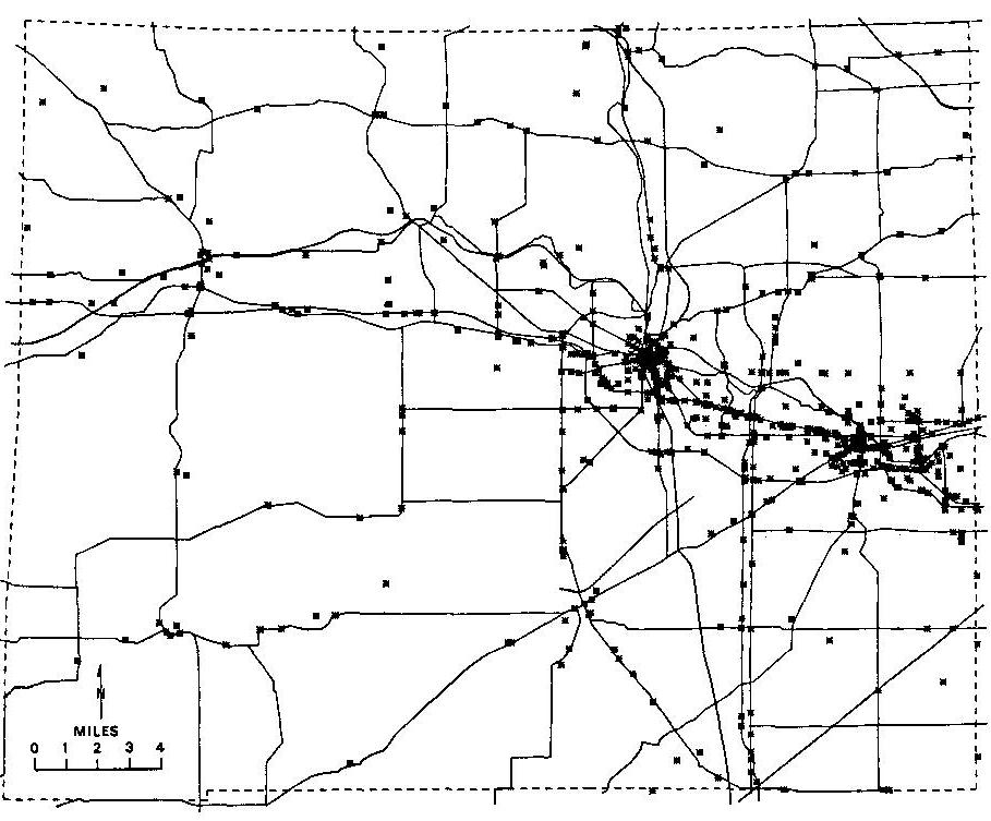 The crash coordinate file also contains 150 other variables collected and generated from the crash reports. These variables contain a great deal of information pertaining to the nature and circumstances of a crash in addition to details of injury patterns of those involved and vehicle damage information. Since the file contains several time variables in addition to the location variables, it is conceptually straightforward to create a CAF to display the data in a spatiotemporal setting. Figure 1 is a simulated frame of the film showing the background map of Washtenaw County, Michigan and crash symbols drawn by plotter.
