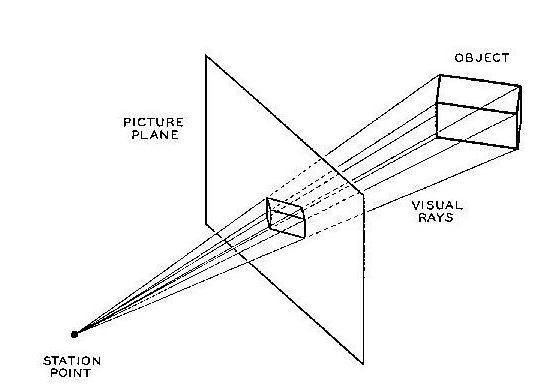 To produce a perspective drawing of an object, it is first necessary to choose some point (representing the eye) from which the object is viewed (see Fig 1). In descriptive geometry terminology, this point is called a station point.[11] A plane, more specifically called a picture plane, is inserted between the object and the station point. Projection lines (actually visual rays) are then drawn from the object to the station point, and their points of intersection with the picture plane are connected to complete the perspective drawing.