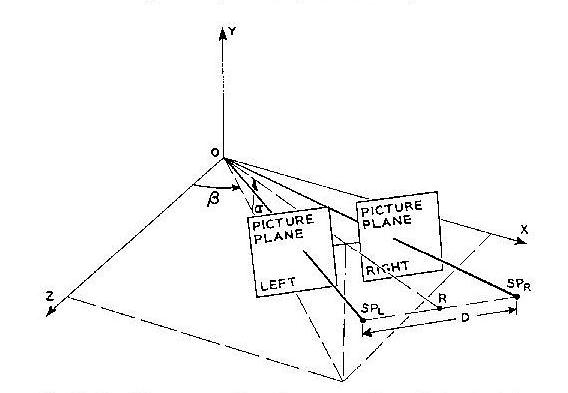 Since two perspectives are required to produce a stereographic drawing, two station points (one for each eye) and two picture planes must be chosen. The object can be viewed from any angle if an angle of inclination and an angle of rotation of the station points are introduced. Assuming that the object is specified in a rectangular coordinate system, the stereographic scheme can be depicted as in Fig 2. The left and right picture planes, the left and right station points, and the angles of inclination and rotation are shown. If an object were to be projected stereographically, lines would be drawn from it to the station points. The intersections of these lines with the picture planes produce two slightly different perspectives, corresponding to the left and right-eye images. When viewed stereoscopically, these two perspectives create the illusion of depth. Of course, the computer does not have the ability to physically draw lines from the object to the station points, and so an analytic treatment of stereographic techniques is required.