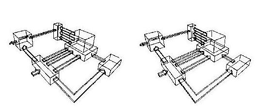 Several examples of stereoscopic drawings produced by the computer are here given. In order to see them, as printed here, it is necessary to decouple one's eyes sufficiently to produce double images. The left and right perspectives are presented next to each other. The trick in looking at them is to decouple the eyes sufficiently to produce a third image centered between the left and right perspective. This task is made easier by first gazing beyond the page and then dropping the eyes to the page without refocusing; a piece of paper placed between and perpendicular to the two perspectives may also help to produce the third image. The third image, when and if obtained, is in depth but is at first blurred. If one continues to look at it for a while, it will become clear, and look remarkably solid.