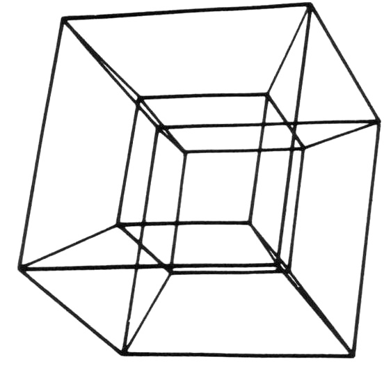 The four-dimensional hypercube is introduced now because of its importance in understanding the motions that result from rotations in four-dimensional space. The three-dimensional perspective projection of s four-dimensional hypercube looks like a three-dimensional cube within a three-dimensional cube as depicted in Figure 2. Some intuitive insight can be gained by considering the two-dimensional perspective projection of a three-dimensional cube, as depicted in Figure 3, which looks like a square within a square. What is happening here is that the face of the cube closest to the projection to the projection plane appears largest while the face farthest away is smallest. If the closest face is paralled to the projection plane, then its perspective projection is undistorted except for its overall size. Thus, the perspective projection of a three-dimensional cube is actually an undistorted two-dimensional face within an undistorted two-dimensional face. Since the face of a four-dimensional hypercube is a three-dimensional cube, the perspective projection of the hypercube with one face parallel to the projection space is a cube within a cube.
