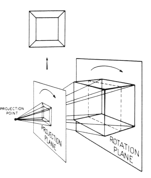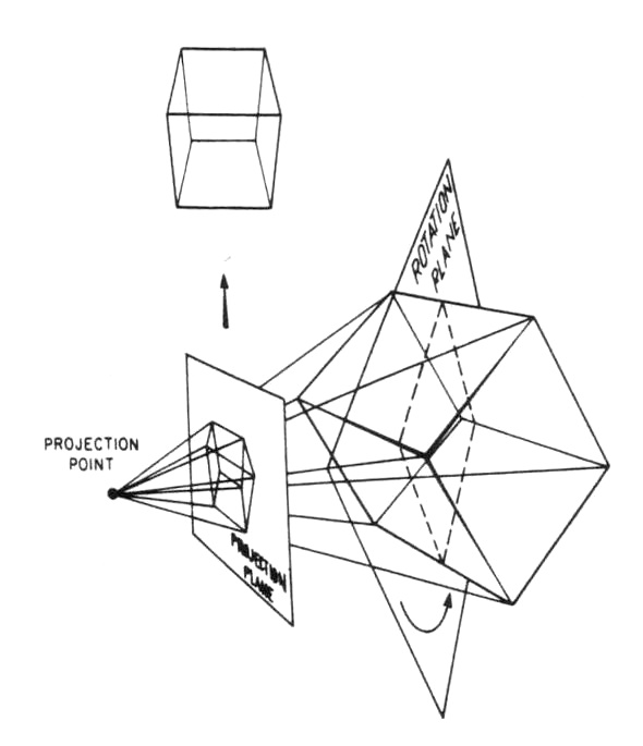 Since we are restricted to three spatial dimensions, it is impossible for us to visualize a fourth spatial dimension. Of course, these problems do not affect the in-human computer which purely manipulates numbers in a mathematical fashion according to specified formulas. But, since we should desire to see the results of the rotations of the hyperobject in four-dimensional space, the computer must perform some transformation upon the hyperobject so that we can look at it. In other words, the four-dimensional object has to be projected to three dimensions so that we can see it in our three=dimensional world.