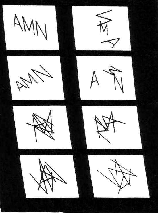 The computer program for producing the movie of the hypercube was general purpose in the sense that any set of four-dimensional points could be used as input. In my mind, I visualized letters rotating and moving through each other in an extremely graceful yet obviously thoroughly controlled manner similar to the motion of the hypercube. To investigate this effect, I used the four-dimensional coordinates of points specifying the end points of straight lines as input to the program. These straight lines formed individual letters which I could easily in effect place on different two-dimensional planes in the four-dimensional space. Conceptually, this is identical to placing the letters on. the two-dimensional planes which make up the hypercube. I chose the letters A, M, and N which form my initials. Some selected frames from the movies corresponding to different configurations of the three letters in four-dimensional space are shown in Figure 5. In the movie, the individual letters appear to float through space or to be hinged together although able to mysteriously distort while rotating as a whole.
