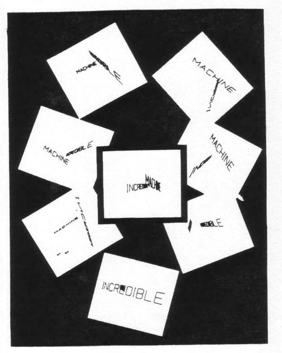 The individual letters of the title of this movie Incredible Machine were converted to straight lines connecting points whose two-dimensional coordinates were then obtained by plotting the letters of each word on graph paper. The two words were then in effect placed upon two different two-dimensional planes in four-dimensional space, and the four-dimensional points of the end points of the lines forming the letters were punched into cards for input to the computer. A number of different configurations of the two words in four=dimensional space were then appraised for their artistic merit by my judgment of the effectiveness of the computer-generated movies of the rotating words. A single configuration was finally chosen, and fairly long movie of the rotating two words was produced. From this movie, a single frame was chosen in which the two words both were individually legible and also formed an aesthetically pleasing overall form.