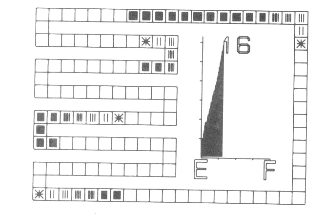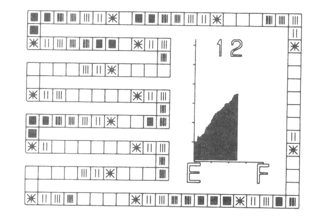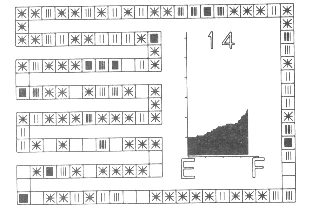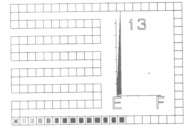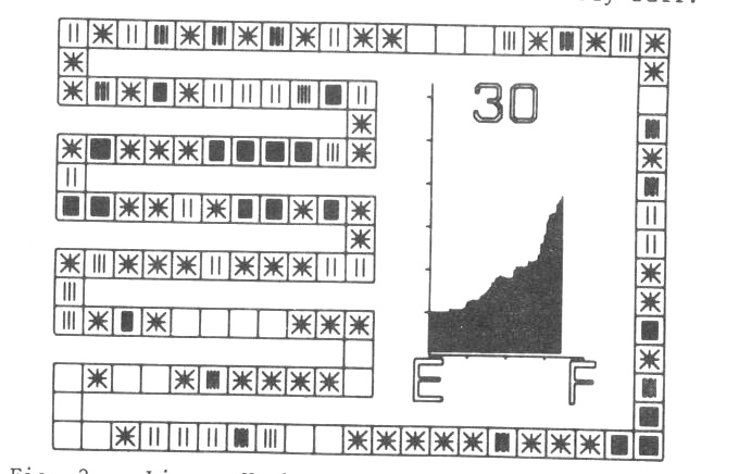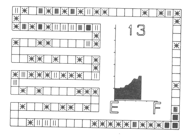 A typical frame of a film is shown in fig. 1. The table is shown as a set of squares around the outside of the frame and covering most of the left hand side. The unusual layout is so that the individual squares representing table positions are as large as possible. The importance of the average length of search as a measure of efficiency is emphasised by including a graph of this which is updated as the table fills. The E and F represent Empty and Full respectively while the scale in the y-direction is in units of 1. The final item on the frame is a number indicating the maximum search length of any entry made so far.
