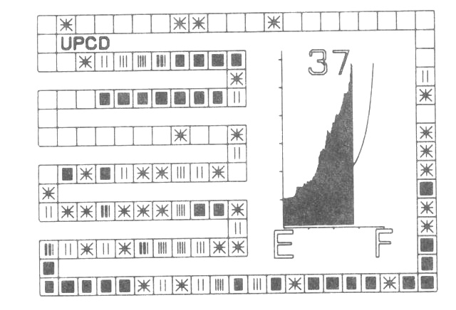 This is illustrated in this final film by following the sequence with a single entry point by sequences involving 4 entry points (fig. 6), 16 entry points (fig. 7) and finally 64 entry points. For each sequence, keys are taken from the complete population at random. At first sight it would appear that dividing the set of keys into P classes should give an average length of search of ½(N/P+1). However, once P becomes large, primary clustering occurs so that two sequences intermingle and the average length of search consequently increases (fig. 7). The main aim of this film is, therefore, to show that the open hash method can be considered as the limit of the extended table look-up method where the set of keys has been divided into as many classes as there are positions in the table. It also highlights the point that long search paths will develop as soon as sequences from different entry points come together. This will normally be the first film of the set shown to the students.