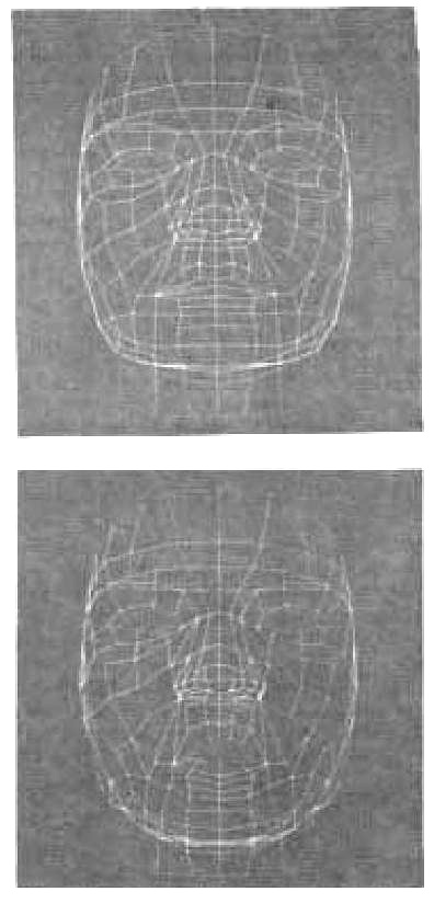 Keeping these things in mind the next step is to find a cooperative assistant who will allow you to draw or paint a set of polygons on his or her face. After drawing the polygon skin on one half of the face, ask the assistant to assume a number of different expressions. For each expression observe how well these polygons approximate the face. After modifying the polygon set several times you should arrive at a reasonable set of polygons to represent the face. Figure 2 shows the skin of polygons used to produce the faces shown in Figure 1, Figure 3, Figure 4. One-half of this skin contains 124 polygons defined by 202 vertices.