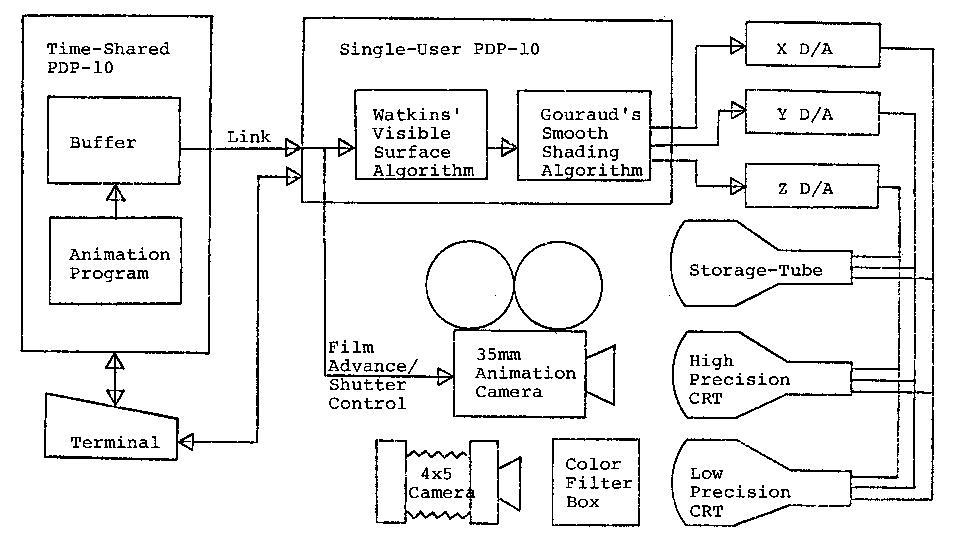 The system used to produce animated sequences, and the half-tone renderings included in this paper is shown in Figure 6. This system uses two PDP-l0 computers. One of these is a dedicated machine that allows only one user at any given time. This processor is interfaced to the special equipment needed to produce half-tone pictures. The other PDP-1O is time-shared, and runs under the TENEX operating system. There is a link between the machines that allows data to be transfered between them.