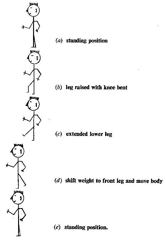 The little man was programmed explicitly. A display file defining his parts was coded and routines to change the vectors in the display file were written. He appeared to walk because the angles and lengths of the vectors defining his legs were changed dynamically in the display file by a routine. Figure 1 illustrates the following explanation. In Fig. l(b) his leg is bent from the hip and his knee is raised causing his foot to come off the floor. In Fig. l(c) he extends his lower leg and in Fig. l(d) his front leg is swung behind to simulate his back leg and at the same time his whole body is moved as his origin is changed. Finally, in Fig. 1(e), his back leg is returned to standing position.