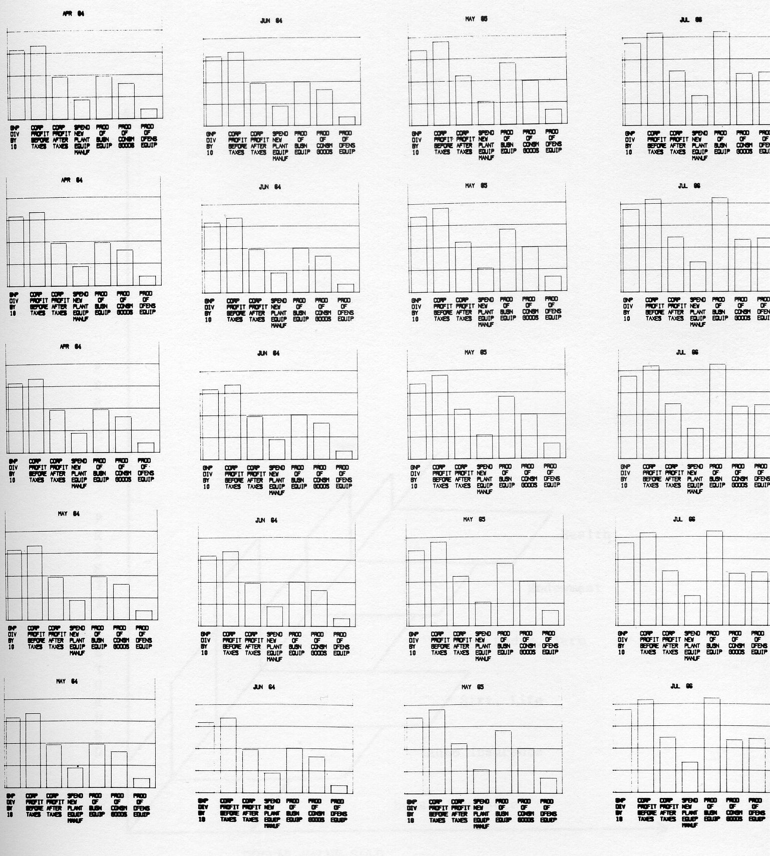 Even the bar chart can be made dynamic. Figure 4 shows several frames from a sequence depicting changes in the GNP over a five year period. Several corporate profit and production quantities for the same time period are displayed. Bar heights are computed to change smoothly between quarterly reported values. The motion of the bars over time can be superimposed with individual company performance records to show how the company is leading or lagging industry wide averages or perhaps not matching them at all. The same information displayed on a geographical basis would be of even greater interest to a management team.