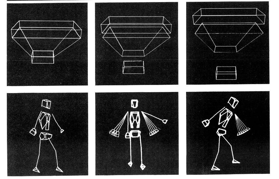 The PDP-9 is not able to produce a new picture frame every 1/24 of a second, because of the amount of calculations (such as persepctive transformations, display file building) which are required. However, if all the display data for each frame is saved on the disc, the PDP-9 is able to monitor the disc and the display, so that frames can be displayed at a rate of 2 per second (real time).