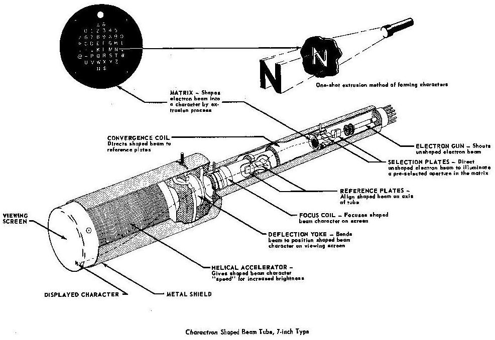 The Electron Gun directs an electron beam toward the matrix through two sets of electrostatic character-selection plates. These plates deflect the beam so that it passes through the particular matrix aperture desired. Thus, as the beam leaves the matrix, it has been shaped in the form of the character aperture through which it has passed. As this shaped beam proceeds toward the tube face, it is accelerated (brightened) and again deflected to the proper position on the tube face. From this description, it can be seen that it takes no longer to print an entire CHARACTRON (beam-shaped) character than it does a single dot.